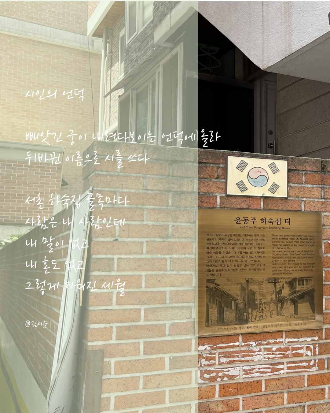 서촌 청운공원에 가면 윤동주 문학관이 있다. 근처에 시인의 언덕이 있고, 그곳에 큰 돌모양 비석에 서시가 새겨져 있다. 시인의 언덕에서 보면 남산도 보이지만 그 아래 경복궁이 보이고, 서촌 마을이 내려다 보인다.
